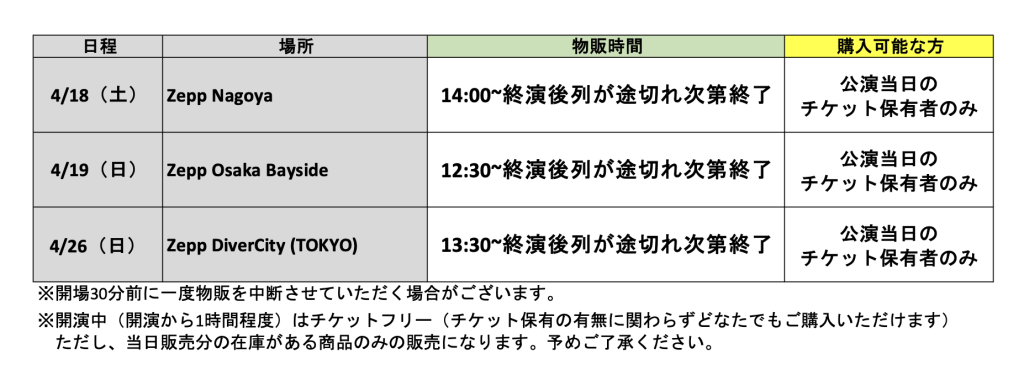 4/18(土)@Zepp Nagoya・4/19(日)@Zepp Osaka Bayside・4/26(日)@Zepp DiverCity(TOKYO)の物販情報を公開いたします!